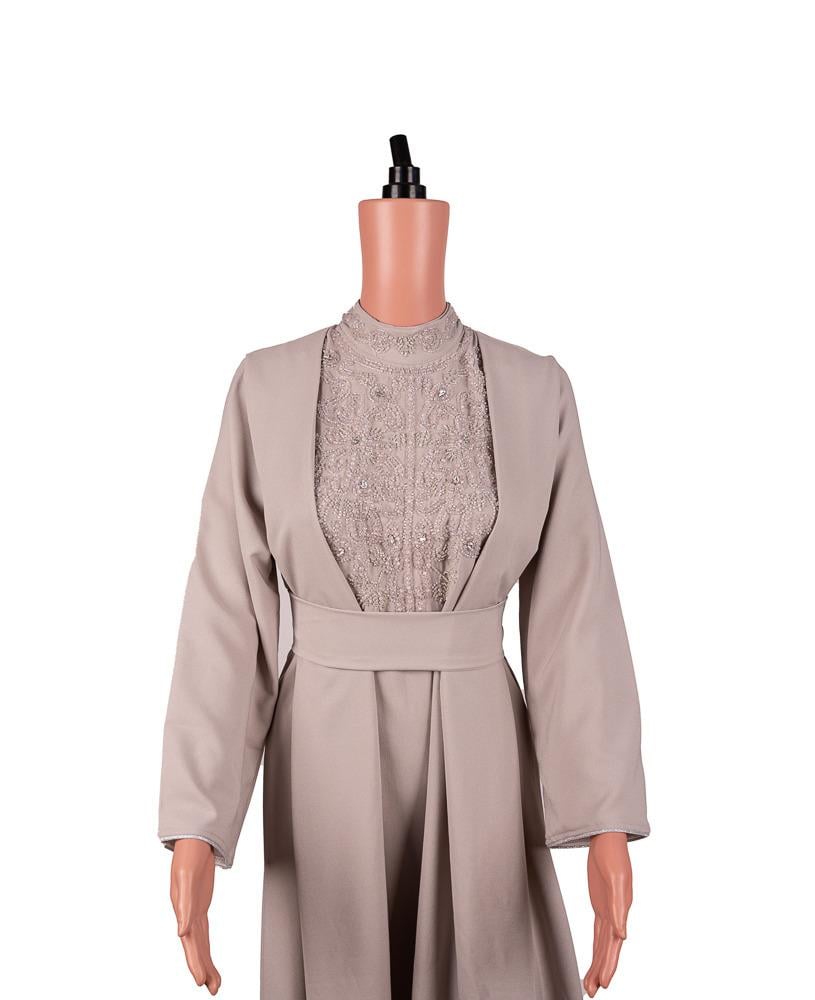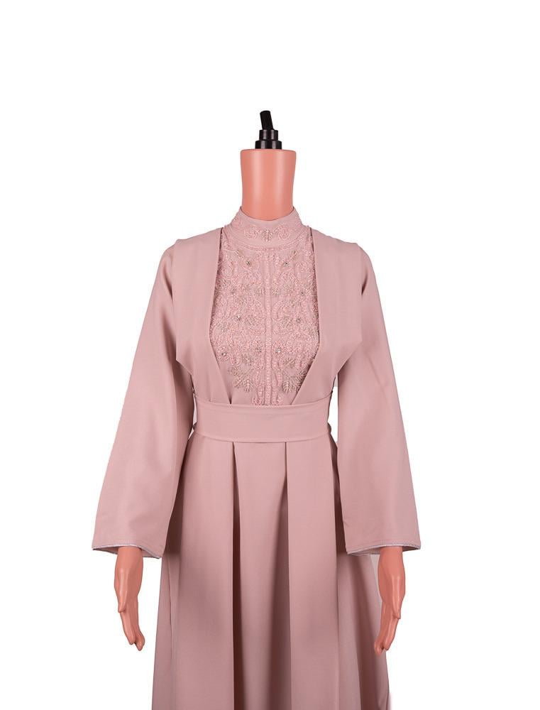 قفطان بتصميم أنيق يزدان بتطريز شك متقن على الصدر يمنح لمسة فنية راقية. يتميز بقَصّة واسعة مع خصر محدد برفق وأكمام مستقيمة تعكس توازناً بين البساطة والفخامة، مما يجعله خياراً مثالياً للمناسبات والسهرات الخاصة.