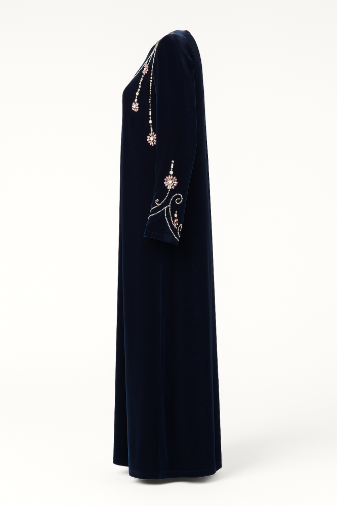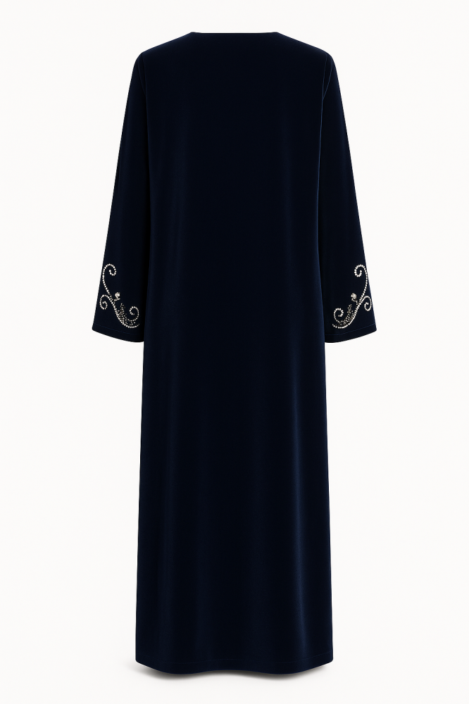 جلابية مخملية بتصميم فاخر يزدان بتطريز كريستالي متقن على منطقة الصدر والأكمام بخيوط لامعة وتفاصيل دقيقة تمنحها طابعاً ملكياً أنيقاً. القماش المخملي الفاخر ينعكس عليه الضوء بانسيابية راقية تضيف عمقاً وبريقاً للإطلالة. الأكمام الواسعة تمنح توازناً بين الفخامة والراحة، والتفاصيل المطرزة الدقيقة تبرز الحرفية العالية في التنفيذ. قطعة مثالية للسهرات والمناسبات الراقية التي تتطلب حضوراً متألقاً وأناقة لافتة.