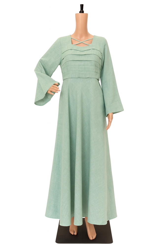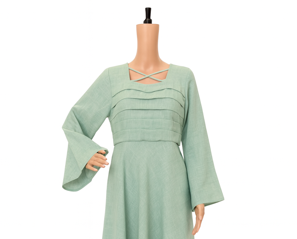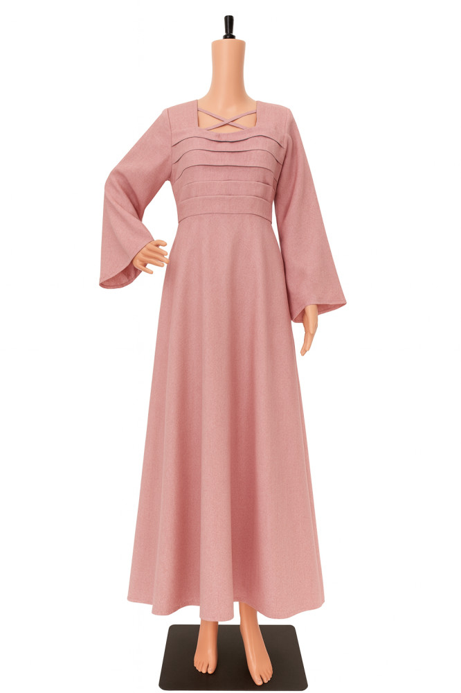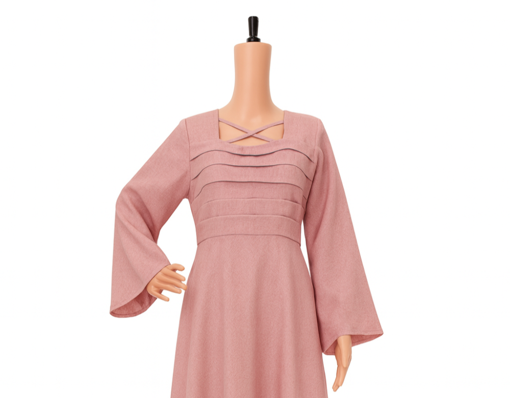 فستان بتصميم أنثوي أنيق يزدان بكسرات متدرجة على الصدر تضيف لمسة من الرقي والبساطة في آنٍ واحد. يتميز بقَصّة منسدلة وأكمام واسعة تمنح حرية في الحركة وانسيابية ناعمة، مع تفاصيل دقيقة عند منطقة الرقبة تضفي طابعاً عصرياً جذاباً. خامة الفستان ناعمة ومريحة، مثالية للمناسبات النهارية أو المسائية التي تتطلب مظهراً متألقاً وأنيقاً دون مبالغة.